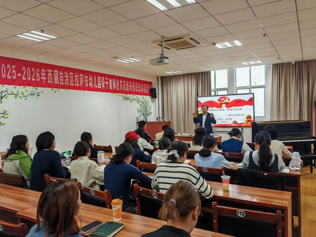9月中旬,第一党支部书记孙玉柱教授受邀为西藏拉萨市幼儿园骨干教师赴江苏高级研修班开展了音乐党课活动。孙玉柱教授用生动的语言、丰富的史料和动听的旋律,为幼儿园骨干教师们带来了一堂精彩纷呈的音乐党课。 党课内容丰富,讲解深入浅出,一首首红色经典歌曲、一段段党史故事,带领骨干教师们重温了那段激情燃烧的岁月和催人泪下的历史。